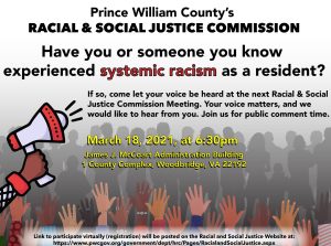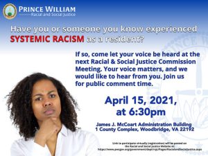 Bailey first made the accusation at the June policing subcommittee meeting of the Prince William County Racial Commission in response to flyers from the commission prodding county residents to share stories and examples of racism committed by Prince William County Government. Examples of the flyers can be seen below.