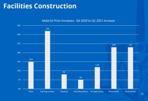 At the end of the presentation, the Board was briefed on the impact of inflation and material shortages on the cost of county projects. The Parks Department has seen the average cost of their projects increase 28% since their initial estimates. Along with increased costs, project timelines have also been pushed back due to material shortages. The Department of Facilities and Fleet Management reported that material wait times grew to an average of 79 days, and delivery times were the longest in recorded data. In the presentation, staff stated “in November 2020, purchasing managers listed just 8 materials companies were struggling to get their hands on. Five months later and it’s expanded to 24.” The presentation also stated, “although prices of lumber have increased average 250%, (the) quality of lumber is substandard.” For example, Parks estimated that the new Catharpin Concession Building would cost $644,166. It is now expected to total $1,013,280 – a 36.43% increase.